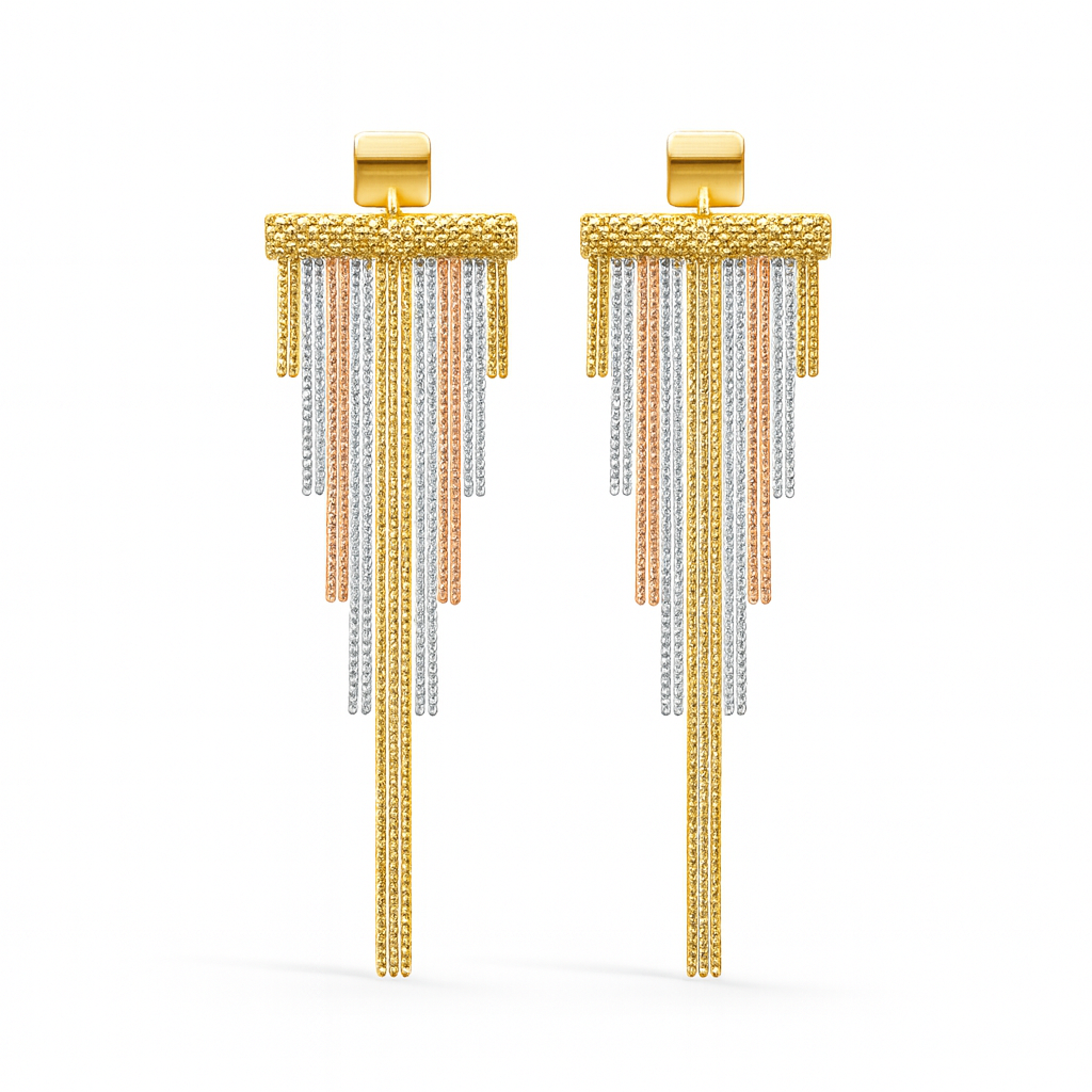 Elegant 925 Sterling Silver tassel earrings featuring 18K gold, rose gold, and rhodium triple-tone plating. The multi-layered chains add a luxurious shine and graceful movement. Lightweight and stylish at 4.950g, perfect for everyday elegance or special occasions.